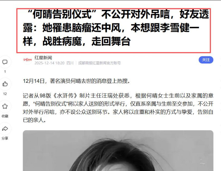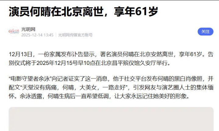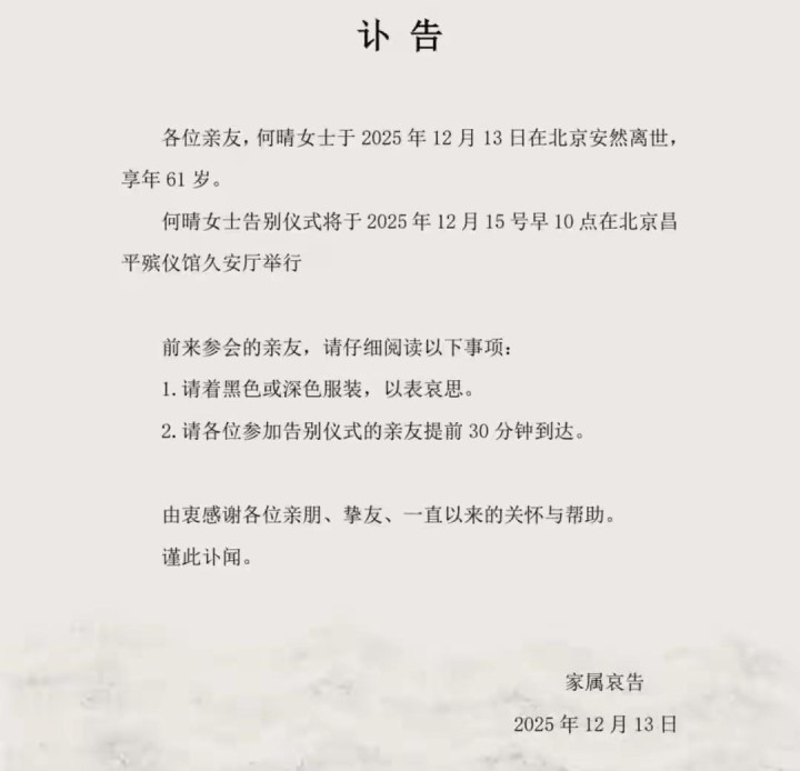 2025年12月13日,何晴在睡梦中安详离世。
