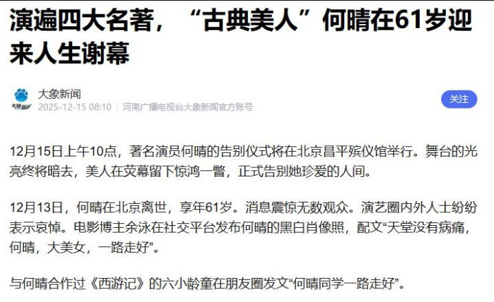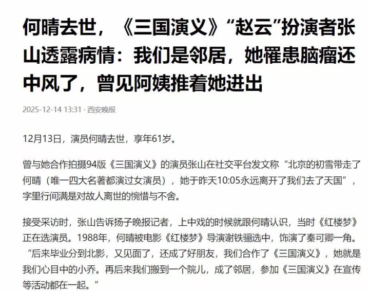 演遍四大名著的“古典第一美人”何晴,于12月13日悄然离世,享年61岁。